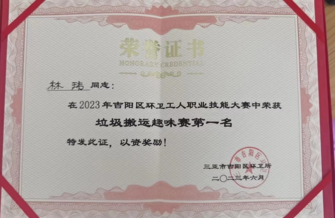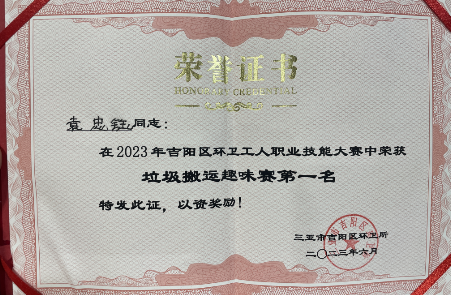 為推動(dòng)吉陽區(qū)環(huán)衛(wèi)保潔質(zhì)量,進(jìn)一步提高一線環(huán)衛(wèi)工人崗位技能素質(zhì),培養(yǎng)技術(shù)技能型人才,激發(fā)廣大環(huán)衛(wèi)工人學(xué)習(xí)技術(shù)、專研業(yè)務(wù)、熱愛環(huán)衛(wèi)事業(yè)。2023年06月08日上午,三亞市吉陽區(qū)環(huán)衛(wèi)所組辦了2023年度吉陽區(qū)環(huán)衛(wèi)工人職業(yè)技能大賽,我司工作人員林瑋、袁忠鈺、梁青妹、符亞認(rèn)、胡亞來代表公司參加此次活動(dòng)比賽,并獲得垃圾搬運(yùn)趣味賽一等獎(jiǎng)、優(yōu)秀組織獎(jiǎng)。
